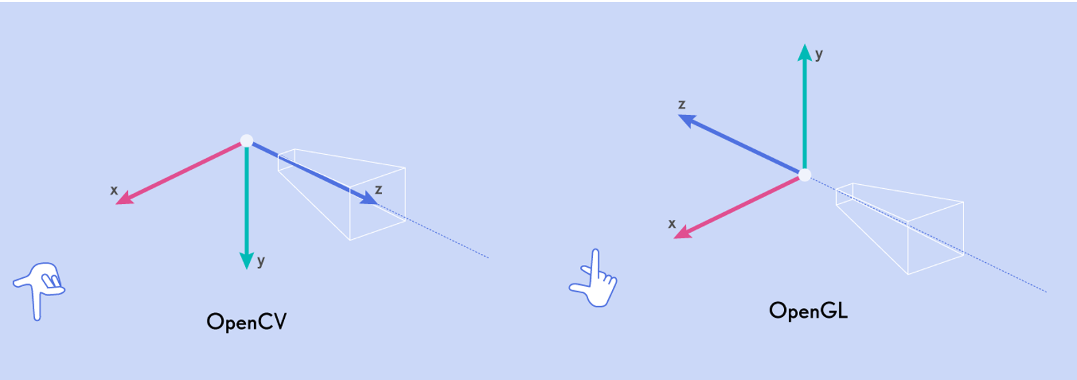 The camera poses stored in transforms.json files follow Blender/OpenGL/NeRF camera conventions where +X is right, +Y is up, and +Z is pointing back and away from the camera, making the camera’s viewing direction -Z. Another common convention is the OpenCV/COLMAP convention, which uses the same X axis, with +Y going down and +Z going into the scene.